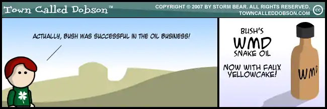 Town Called Dobson is a liberal editorial cartoon in the form of a webcomic written and illustrated by Storm Bear. The week-daily cartoon deals with being a liberal in red America. The cultural clash between left vs. right politics is the main focus of the cartoon and reflects the creator's life growing up in Dobson, NC.