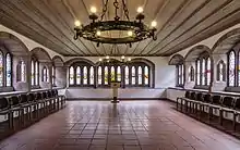 During Operation Tigerfish in 1944, the old town hall burned out completely and the entire interior decor was lost. Modern materials were used in the reconstruction of the building. The Old Town Hall was also extended by 3 wings in the plain functional style usual for that time. As a result of the new construction, only the nuns' undercroft of the convent of Poor Clares was preserved. This convent was housed in the former Regelhaus (a quasi-monastic building) Zum Lämmlein from 1672 until its abolition in 1782. After that, the buildings were used by the "Hospital of the Holy Spirit".[3]