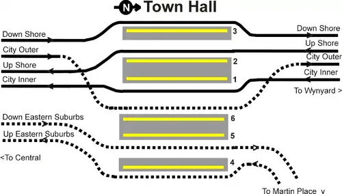 Town Hall has two platform levels, each with three platforms – physically two island platforms, but set up so that one faces two tracks and the other faces the other track. Each platform has one lift in the centre connecting the concourse with the platforms, providing Easy Access for wheelchairs. These facilities were constructed during 2003–2004. The lower-level platforms (4 to 6) have 4 escalators to the concourse. As the platform is not wide enough, the escalators are in a cross configuration, with two at either end of the platform and another two at the centre. The escalator directions can be changed by staff throughout the day as the passenger flow dictates. The upper-level platforms have stairs up to the concourse. There are also small staircases linking the two platform levels.