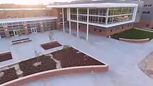 The Raleigh and Augusta Air–Line Railroad arrived in Cary in 1879, creating Fetner Junction just north of downtown and spurring further growth. Sixteen Cary residents purchased Cary Academy in 1896 and converted it into the private boarding school, Cary High School, which had 248 students from across the state by 1900.[38][39][20] When the North Carolina legislature passed a law establishing a system of public high schools in 1907, Cary High School was transferred to the State for $2,750, giving Cary its claim of having the first state-funded public high school in the state.[39][40] Town bonds and the State funded a new brick school building in 1913; it was expanded in 1939 with WPA assistance.[25] Today that structure survives as the Cary Arts Center.[41]