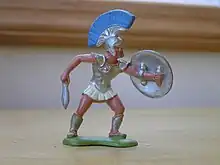 A toy soldier is a miniature figurine that represents a soldier. The term applies to depictions of uniformed military personnel from all eras, and includes knights, cowboys, American Indians, pirates, samurai, and other subjects that involve combat-related themes. Toy soldiers vary from simple playthings to highly realistic and detailed models. The latter are of more recent development and are sometimes called model figures to distinguish them from traditional toy soldiers. Larger scale toys such as dolls and action figures may come in military uniforms, but they are not generally considered toy soldiers.