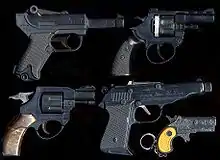 Ray guns are a science fiction particle-beam weapon that fires what is usually destructive energy. They have various alternate names: ray gun, death ray, beam gun, blaster, laser gun, laser pistol, phaser, zap gun, etc. In most stories, when activated, a raygun emits a ray, typically visible, usually lethal if it hits a human target, often destructive if it hits mechanical objects, with properties and other effects unspecified or varying. Toy ray guns often have a mechanical component that sparks, light-up and make a sound effect.
