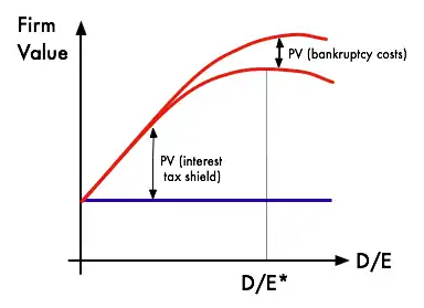 As the debt equity ratio (i.e. leverage) increases, there is a trade-off between the interest tax shield and bankruptcy, causing an optimum capital structure, D/E*. The top curve shows the tax shield gains of debt financing, while the bottom curve includes that minus the costs of bankruptcy.