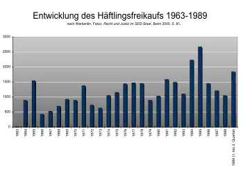 2. 1 2 3 Katja Iken (24 October 2011). "Häftlingsdeals mit der DDR ... 40.000 D-Mark für die Freiheit: Von 1963 bis 1989 verkaufte das SED-Regime fast 34.000 politische Gefangene an die Bundesregierung. Erst gegen Geld, später gegen Güter". Der Spiegel (online). Retrieved 31 January 2016.