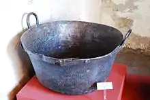 While copper was worked in some parts of Mesoamerica, modern Mexican tradition is Spanish in origin.[29] Copper working was initially ignored by the Spanish conquistadors as they were looking for gold and silver. It was not shipped to Spain as much as the other two. Instead, it eventually became important for the creation of utilitarian items, especially domestic items such as pots and pans.[15] Today, the center of traditional copper work in Mexico is the state of Michoacán, especially the municipality of Santa Clara del Cobre. One traditional hammered copper object is a large vessel in which pork fat is rendered or sugar caramelized for making candies. Every year during the month of August Santa Clara del Cobre holds a copper festival.[30]