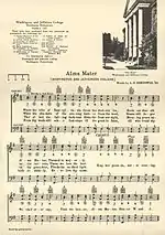 The "Alma Mater of Washington & Jefferson College", lyrics by L. D. Hemingway, class of 1902, and set to an 1857 tune ("Annie Lisle") used by many colleges, was first printed in the 1902 book Songs of Washington & Jefferson College.[5] However, the song was not listed in any commencement program until 1908.[5] However, the exact date of its adoption as the official alma mater is not clear: the July 1908 edition of College Bulletin, an alumni publication, stated that the college had no recognized Alma Mater song, but expressed hope that this "defect would be remedied."[5] Oddly, 1908 was also the first year that the song appeared in any Commencement ceremony.[5] The alma mater is to be followed by a round of "Whichi Coax".[1] The "Washington & Jefferson College Hymn", a different song from the alma mater, was composed by Julian G. Hearne, class of 1926.[6] In 2006, the W&J Magazine reported on the existence of several other lost songs, including "My Term Report", "The Red and The Black", "M’Millan’s March", "Alumni Song", "The College Anthem", and "Red and Black."[5]