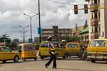 In the 2010s, the Congolese National Police deployed automated traffic police robots. Created by Thérèse Kirongozi, an engineer from the Democratic Republic of the Congo,[7] the tall solar-powered aluminum robots are positioned in intersections and are able to rotate, but cannot actually move; rather, they contain closed-circuit television cameras in their "eyes" that record offenders for human traffic officers to handle.[8] The robots also carry red and green lights to direct traffic, and can speak to pedestrians and help them cross roads.[9][10] Five robots were installed in intersections in Kinshasa by 2015, with thirty more planned for highway patrol purposes.[9]