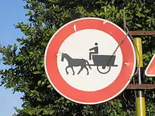 Regulatory road signs – other than the stop and give way signs – are generally circular, with (for prohibitions) a black symbol on a white background within a red border, or (for mandatory instructions) a white symbol on a blue background. In some cases circular regulatory signs are placed on white rectangular panels together with text supplementing their meanings.