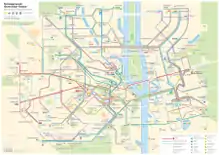 The Kyiv Tram is a tram network that serves the Ukrainian capital Kyiv. The system was the first electric tramway in the former Russian Empire and the fourth one in Europe after the Berlin, Budapest, and Prague tramways. The Kyiv Tram system currently consists of 139.9 km (86.9 mi) of the track,[3] including 14 km (8.7 mi) of two Rapid Tram lines, served by 21 routes with the use of 523 tram cars. However, the system is being neglected, the serviced track length is decreasing at a fast rate and is replaced by buses and trolleybuses.
