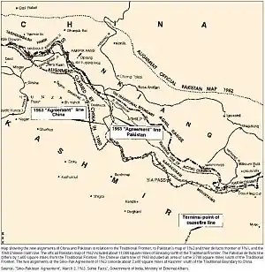 Official alignment of the Government of Pakistan in 1962. The border is in the extreme north and is depicted as a dotted line with the caption Alignment Official Pakistan Map 1962