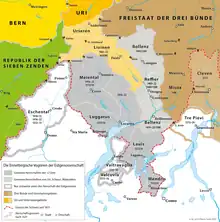 Overview of the transalpine bailiwicks (German: Ennetbergische Vogteien, Italian: Baliaggi Ultramontani):