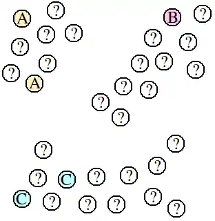 A collection of points is given, such that some of the points are labeled (A, B, or C), but most of the points are unlabeled (?). The goal is to predict appropriate labels for all of the unlabeled points.