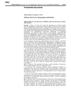 - ↑ Mattis, James (September 14, 2017). "Memorandum: Military Service by Transgender Individuals – Interim Guidance" (PDF). Secretary of Defense. Archived (PDF) from the original on September 27, 2017. Retrieved September 27, 2017.