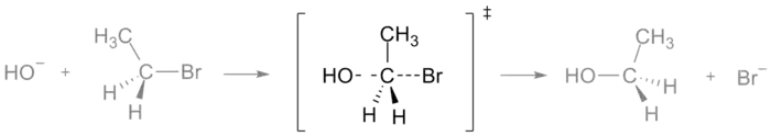 As an example, the transition state shown below occurs during the SN2 reaction of bromoethane with a hydroxide anion: