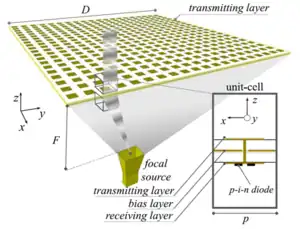A transmitarray antenna (or just transmitarray or called as layered lens antenna[2]) is a phase-shifting surface (PSS), a structure capable of focusing electromagnetic radiation from a source antenna to produce a high-gain beam.[3] Transmitarrays consist of an array of unit cells placed above a source (feeding) antenna.[4] Phase shifts are applied to the unit cells, between elements on the receive and transmit surfaces, to focus the incident wavefronts from the feeding antenna.[4] These thin surfaces can be used instead of a dielectric lens. Unlike phased arrays, transmitarrays do not require a feed network, so losses can be greatly reduced.[1] Similarly, they have an advantage over reflectarrays in that feed blockage is avoided.[5]