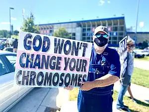 Those who oppose transgender rights argue that "irresponsible parents" and young people are rushing to make decisions about their trans identities and they also argue that these decisions are based on "social contagion".[12] Conservative activists question the need to talk to children about their gender or sexual identities.[13] Activists who oppose gender-affirming care claim that physicians and parents are putting children through "irreversible medical treatments" without proper safeguards.[14] Some states have pushed for laws banning gender-affirming care by claiming that medical treatment for transgender youth is "child abuse."[15] Social media accounts, such as Libs of TikTok, have helped spread a moral panic about gender-affirming care.[16][17] Many groups and individuals, despite a lack of evidence for their beliefs, are creating a "culture war" around transgender people.[18]