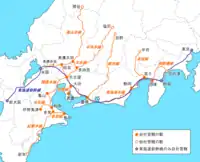 The passenger rail network in Greater Nagoya is fairly dense with 3 million passenger daily (1.095 billion annually).[2] Passenger railway usage and density is lower than that of Greater Tokyo or Greater Osaka, as generally the trend in Japan, few free maps exist of the entire network, operators show only the stations of a their respective company and key transfer points. In addition to above-ground and below-ground rail lines, the Tōkaidō Shinkansen serves as the backbone of intercity rail transport. The Chuo Shinkansen is planned to pass through Nagoya.