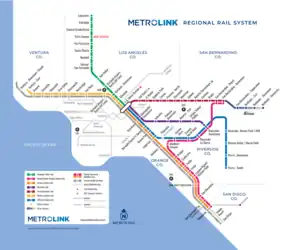 Also serving Los Angeles and several surrounding counties is Metrolink, a regional commuter rail service. Metrolink averages 42,600 trips per weekday, the busiest line being the San Bernardino line.[28]