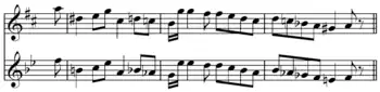 The transposition of a set A by n semitones is designated by Tn(A), representing the addition (mod 12) of an integer n to each of the pitch class integers of the set A.[1] Thus the set (A) consisting of 0–1–2 transposed by 5 semitones is 5–6–7 (T5(A)) since 0 + 5 = 5, 1 + 5 = 6, and 2 + 5 = 7.