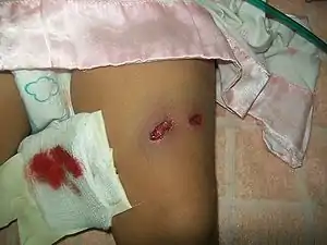 | A gunshot wound to the left thigh showing entry and exit wound of a 3 year old girl. | |
