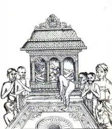Maharajah Sree Anizham Thirunal dedicated the Kingdom of Travancore to his family deity Sri Padmanabhaswamy on 3 January 1750 and after that he was referred to as Sree Padmanabhadasa Vanchipaala Maharajah Sree Anizham Thirunal Veerabaala Marthanda Varma Kulasekharaperumal. The Kings of Travancore, taking the title of "Sree Padmanabhadasa," ruled the kingdom as the servant of that deity. This important donation of the Kingdom to the Temple was known as "Thripadidaanam."[17] Travancore as a whole, thus became the property of Sri Padmanabhaswamy, the deity of the Travancore royal family or in other words "God's Own Country."[18] It is erroneously believed that use of the title "Sree Padmanabhadasa" before royal male members' names came into being after Thrippadidaanam, but this title was in use even in the 16th century. During the first birthday ceremony of Maharajah Karthika Thirunal Rama Varma (Dharmaraja) in 1725, he is referred to as "Sree Padmanabhadasa" which was much before the Thrippadidaanam (1750) by Maharajah Anizham Thirunal Veerabaala Marthanda Varma. The title of "Sree Padmanabhadasa" is prefixed to the name of every Travancore King while the royal women are "Sree Padmanabhasevinis." In order to get the eligibility for attaining the title of "Sree Padmanabhadasa," certain rituals must be completed at the birth of new royal male members. On the first birthday of every royal male members would be put on the 'Ottakkalmandapam' of the Sree Padmanabhaswami Temple and holy water from the temple will be sprinkled on the baby and only after completion of this ceremony, the royal child is proclaimed as "Sree Padmanabhadasa." The female members also have a ritual called "Padiyettam" which is conducted only after their "Pallikettu" (wedding of Travancore Princesses and Queens). Only those male and female members who complete these ceremonies are allowed in the temple affairs and are also provided respect as well as the titles associated with temple as well as the royal family.'[19][20]