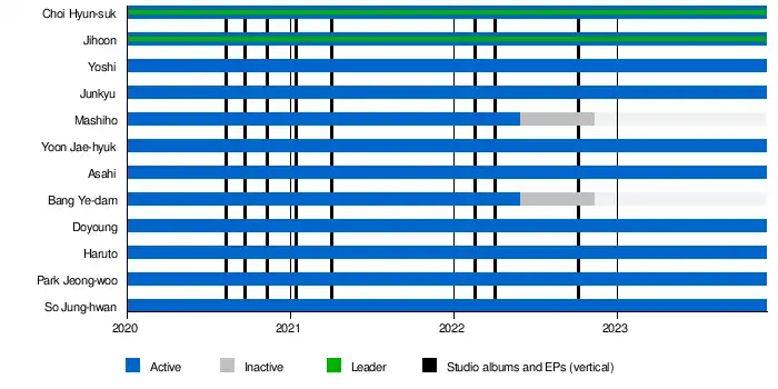 ![]() Treasure in August 2023; L-R from the top: Haruto, Doyoung, Park Jeong-woo, So Jung-hwan, Yoon Jae-hyuk, Asahi, Kim Jun-kyu, Choi Hyun-suk, Yoshi, Jihoon | |