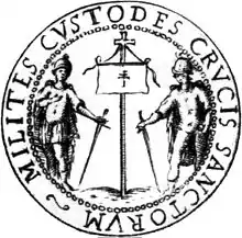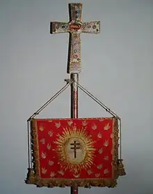 In 1764 Count Bartolomeo Martinengo, president of the Company of the Custodians of the Holy Crosses, had an exact copy of the Cross of the Field made to be used as a processional cross for the regular processions organized by the company, thus avoiding the need to take out the real cross on each occasion.[29] A reproduction of the banner of the Oriflamme, also believed by Valentini to be a copy of the lost original, was added to the new cross.[30]