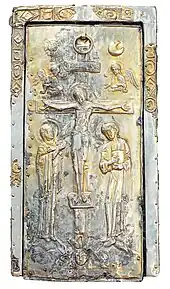 On the left is Mary with her face expressing sorrow, while on the right is St. John with the book of the Gospels clutched to his chest, both richly attired. Both the cross and the two lateral figures are placed atop pyramidal mounds, and the central one, from which the crucifix rises, has at its base the face of a man with closed eyes with three pieces of wood embedded in his head. This man can be identified with Adam, a symbol of the multitude of the righteous resurrected at the time of Jesus' death.[15] At the top of the cross hangs the titulus crucis with the inscription "IC XC," meaning Iésus Christós, completing the iconography of the double transverse cross. Above the horizontal arm of the cross, on either side of the titulus, are depicted two half-length angels with wings and tunic and a veil in their hands, in an attitude of sorrowful veneration. Above, in remembrance of the solar eclipse that occurred at the death of Jesus,[15] are the Sun on the left, depicted as a radiating disk, and a crescent moon and right, a symbol of the Moon. Finally, attached to the top of the cross is the ring that allows the casket to be opened. The staurotheke can be opened by sliding downward the lid, which slides along two rail guides.