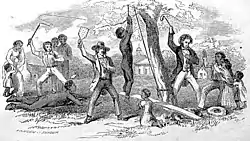 Slaves were punished for a number of reasons: working too slowly, breaking a law (for example, running away), leaving the plantation without permission, insubordination, impudence as defined by the owner or overseer, or for no reason, to underscore a threat or to assert the owner's dominance and masculinity. Myers and Massy describe the practices: "The punishment of deviant slaves was decentralized, based on plantations, and crafted so as not to impede their value as laborers."[20] Whites punished slaves publicly to set an example. A man named Harding describes an incident in which a woman assisted several men in a minor rebellion: "The women he hoisted up by the thumbs, whipp'd and slashed her [sic] with knives before the other slaves till she died."[21] Men and women were sometimes punished differently; according to the 1789 report of the Virginia Committee of the Privy Council, males were often shackled, but women and girls were left free.[21]