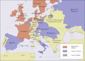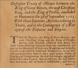 The Treaty of Hanover was a treaty of defensive alliance signed on 3 September 1725 by the Kingdom of Great Britain, the Electorate of Hanover, the Kingdom of France and the Kingdom of Prussia. The alliance was formed to combat the power of the Austro-Spanish alliance, which was founded at the Peace of Vienna months earlier in May 1725.[1]