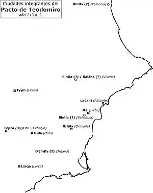 Location of cities forming part of the Treaty of Orihuela, year 713.