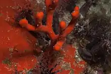 The tree sponge may grow to 150 mm (5.9 in) in height. It is a bright red to dirty orange sponge which grows upright and branches like a tree.[1][2] The surface texture is smooth and the branch tips are rounded.[1] Its oscula are small (<1 mm (0.039 in) and inconspicuous.[1][2] The surface may be covered in a slimy mucus.[2]