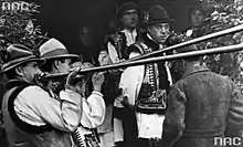 A trembita was used primarily by mountain dwellers known as Hutsuls and Gorals in the Carpathians, it was used as a signaling device to announce deaths, funerals, weddings.