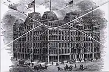The fourth hotel was designed by John M. Van Osdel, who had designed the previous third hotel. It opened its doors in 1873. It stood six floors.[1] It was constructed James Couch and the estate of his brother Ira Couch, who had himself passed away in 1857.[5][6] The rebuilt hotel remained along with the Palmer House, Grand Pacific Hotel and the Sherman House as a leading hotel after the Great Chicago Fire.[2] It was built in the commercial palazzo architecture style of the day and claimed to be fireproof.[2] James Couch and his son Ira Couch (not to be confused with his late brother of the same name) were the proprietors of the new fourth incarnation of the hotel at its opening.[3] The hotel was one of the city's "big four" post-fire hotels, the other three being the Grand Pacific, Palmer House, and the Sherman House.[16]