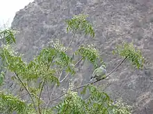Bruce's green pigeon (Treron waalia), also known as the yellow-bellied fruit pigeon, is a species of bird in the family Columbidae. It is found in Benin, Burkina Faso, Cameroon, Central African Republic, Chad, Democratic Republic of the Congo, Ivory Coast, Djibouti, Eritrea, Ethiopia, Gambia, Ghana, Guinea, Guinea-Bissau, Kenya, Mali, Mauritania, Niger, Nigeria, Oman, Saudi Arabia, Senegal, Somalia, Sudan, Togo, Uganda, and Yemen. It is often found on farmland and near rivers.[2] It is a frugivore bird species that specialises on eating the fruits of a single species of fig tree, Ficus platphylla.[3] Unlike most birds, it does not have a uropygial gland.[4]