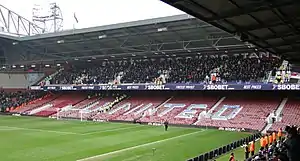 In 2009 West Ham United announced that from 8 August, the start of the 2009/10 Premier League Season, 'The Centenary Stand' at Upton Park would be named 'The Sir Trevor Brooking Stand' in his honour.[52] The stand was used by away supporters and had been the scene for crowd disturbances. In 2009 in a match between West Ham and Millwall seats were torn out by Millwall fans and hurled towards West Ham fans.[53] In subsequent seasons, Millwall fans were segregated to the upper tier of the stand and kept at least 30 yards from West Ham fans to prevent crowd disturbances.[54] A stand at the Olympic Stadium is also named after Brooking and used by West Ham after their move from the Boleyn Ground from the start of the 2016–17 season.[55]