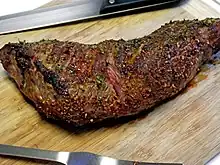 Sometimes labeled "Santa Maria steak", the roast is popular in the Central Valley regions and the Central Coast of California.[11] Along with top sirloin, tri-tip is considered central to Santa Maria-style barbecue. In central California, the fat is left on the outside of the cut to enhance flavor when grilling, while butchers elsewhere trim the fat side for aesthetic purposes.
