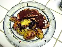 It became a local specialty in Santa Maria in the late 1950s.[9] Today, it is seasoned with salt, pepper, fresh garlic, and other seasonings, grilled directly over red oak wood to medium-rare doneness. Alternative preparations include roasting whole on a rotisserie, smoking in a pit, roasting in an oven, grilling, or braising in a Dutch oven after searing on a grill. After cooking, the meat is normally sliced across the grain before serving.[10]