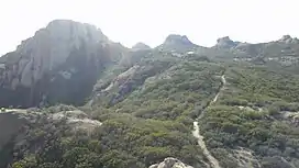 ![]() Tri Peaks to the right, besides Exchange Peak to the left, Backbone Trail in the middle | |