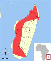 Triaenops menamena mainly occurs in the dry regions of western Madagascar, but has also been recorded in humid areas in the far southeast and northeast,[8] and is found up to 1300 m (4300 ft) above sea level.[1] It mainly occurs in forests,[26] but has also been recorded outside forest and is not dependent on it.[1] An obligate cave dweller,[27] it is known to roost in large colonies, with one cave colony estimated to contain over 40,000 bats; this cave also contained an estimated 10,000 Paratriaenops furculus.[28] The effective population size of the species is estimated to be about 121,000.[29] Lepidoptera (butterflies and moths) form the main component of its diet, but it also eats Coleoptera (beetles) and Hemiptera (bugs) and fewer members of some other insect orders.[30] It is unclear how the ecological niches of Triaenops and the less frequently captured Paratriaenops furculus are separated, as both eat lepidopterans and occur in the same regions.[31]