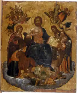 The painting is made of egg tempera and gold leaf on wood. It features a height of 54 cm (21.3 in.) and a width of 45.5 cm (18 in.). The portable icon was not well maintained. It contains some degree of damage. Christ is floating on a cloud similar to the magnificent work by Raphael. To our left, the Virgin Mary is present. The other main figure, John the Baptist appears on our right. They are in the traditional deesis form. Their garments are painted in the style following the mannerisms of the Cretan School. The four evangelists are presented in animal form. In front of the Virgin Mary, an eagle appears symbolizing John the Evangelist. Below the eagle, the Lion of Venice is present. The divine creature symbolizes Saint Mark. On the side featuring John the Baptist, the symbol of Saint Matthew appears in the form of an angel holding an open book. Below the child-like angel, the ox of Saint Luke emerges looking up at Jesus. The four creatures are frequently used by painters of the Cretan School and the Heptanese School. Two angels are at Jesus's legs. The angel to our left holds a holy cup receiving the blood of Christ. To our right, another angel holds a piece of bread. Both are symbols of the holy communion. His legs rest on an all-seeing eye. It features a decorative motif. The supernatural group of figures float on a cloud in the heavens. The figures appear weightless in a spaceless setting. The artist commits to representing the painted figures in a three-dimensional style. The symbols of the passion are carried by six angels in the upper portion of the work of art. To our left, three angels carry the cross, to our right the column of scourging appears. A well-preserved notable copy of the work is at the National Gallery of Athens.[10][11]