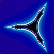 In mathematics, the tricorn, sometimes called the Mandelbar set, is a fractal defined in a similar way to the Mandelbrot set, but using the mapping instead of used for the Mandelbrot set. It was introduced by W. D. Crowe, R. Hasson, P. J. Rippon, and P. E. D. Strain-Clark.[1] John Milnor found tricorn-like sets as a prototypical configuration in the parameter space of real cubic polynomials, and in various other families of rational maps.[2]