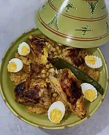 Trida (Arabic: تريدة), also known as mkafta, is a traditional Algerian dish[1][2] made with handcrafted square-shaped pasta, chicken, meatballs, chickpeas, and hard-boiled eggs, all served with a white sauce or red sauce with tomatoes.[3][4] This dish is often served during Yennayer, the Berber New Year.[5]