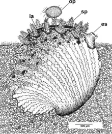 | Trigonulina ornata in its natural habitat. Abbreviations: es, exhalant siphon; ia, inhalant aperture; op, ostracod prey; sp, siphonal papilla | |