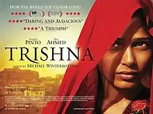 Trishna is a 2011 drama film, written and directed by Michael Winterbottom, and starring Freida Pinto and Riz Ahmed. A British-Swedish-Indian co-production, it is an adaptation of Thomas Hardy's 1891 novel Tess of the d'Urbervilles. It is Winterbottom's third Hardy adaptation, after Jude and The Claim. The film premiered at the Toronto International Film Festival on 9 September 2011, and after some further festival appearances it saw its first cinema release in the United Kingdom and Ireland on 9 March 2012.[2]
