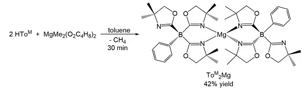 ToMMgMe is an effective precatalyst for the cross-dehydrocoupling of Si-H bonds in organosilanes and N-H bonds in amines to give Si-N bonds and H2.[2] Furthermore, tris(oxazolinyl)borate yttrium alkyl and amide compounds (ToMYR2) can be used as precatalysts for the cyclization of aminoalkenes.[5]