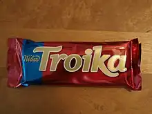 Troika is a chocolate-based confection made by Nidar AS of Trondheim, Norway. It consists of three distinct layers, prompting its name "Troika". The top layer is soft raspberry jelly, the middle layer is truffle, and the bottom one is marzipan. It is also covered with dark chocolate.[1] Troika was launched in 1939 with the name "Geletrøffel". The name of the chocolate is inspired by the Russian word "Troika", which means a group of three.