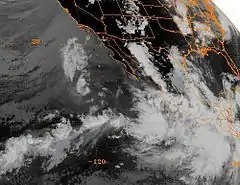 On August 22, the cloud pattern of Gil became better organized, though the low-level circulation was located to the northeast of the deep convection due to the wind shear.[38] The shear also limited outflow to the east, preventing further strengthening. Gradually the convection developed nearer to the center.[39] After Gil turned to the northwest, the deep convection organized into a central dense overcast, and it strengthened to reach winds of 60 mph (97 km/h) on August 24.[40] Later that day the storm attained a peak strength of 65 mph (105 km/h) while located 380 mi (610 km) southwest of the southern tip of Baja California Peninsula. After maintaining its peak strength for 30 hours, Gil moved over progressively cooler waters, and weakened to a tropical depression on August 26. The depression drifted westward and later turned to the north, and dissipated on August 27 while located 670 mi (1,080 km) to the west of Cabo San Lucas.[34] While located a short distance off of Mexico, Gil produced heavy rainfall near the coast.[36] However, there were no reports of casualties or damages in association with the storm.[34]