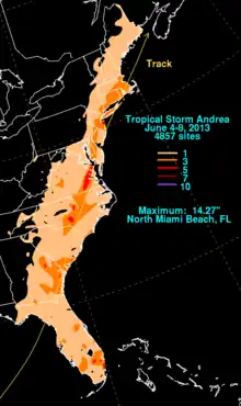 - ↑ David M. Roth (July 5, 2013). Tropical Storm Andrea June 4-8, 2013. Weather Prediction Center (Report). College Park, Maryland: National Oceanic and Atmospheric Administration. Retrieved February 27, 2014.