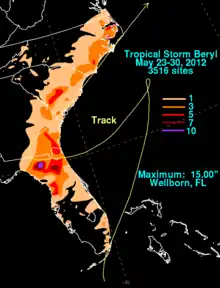 - ↑ David M. Roth (June 12, 2012). Tropical Storm Beryl – May 23–30, 2012 (Report). Hydrometeorological Prediction Center. Retrieved June 20, 2012.